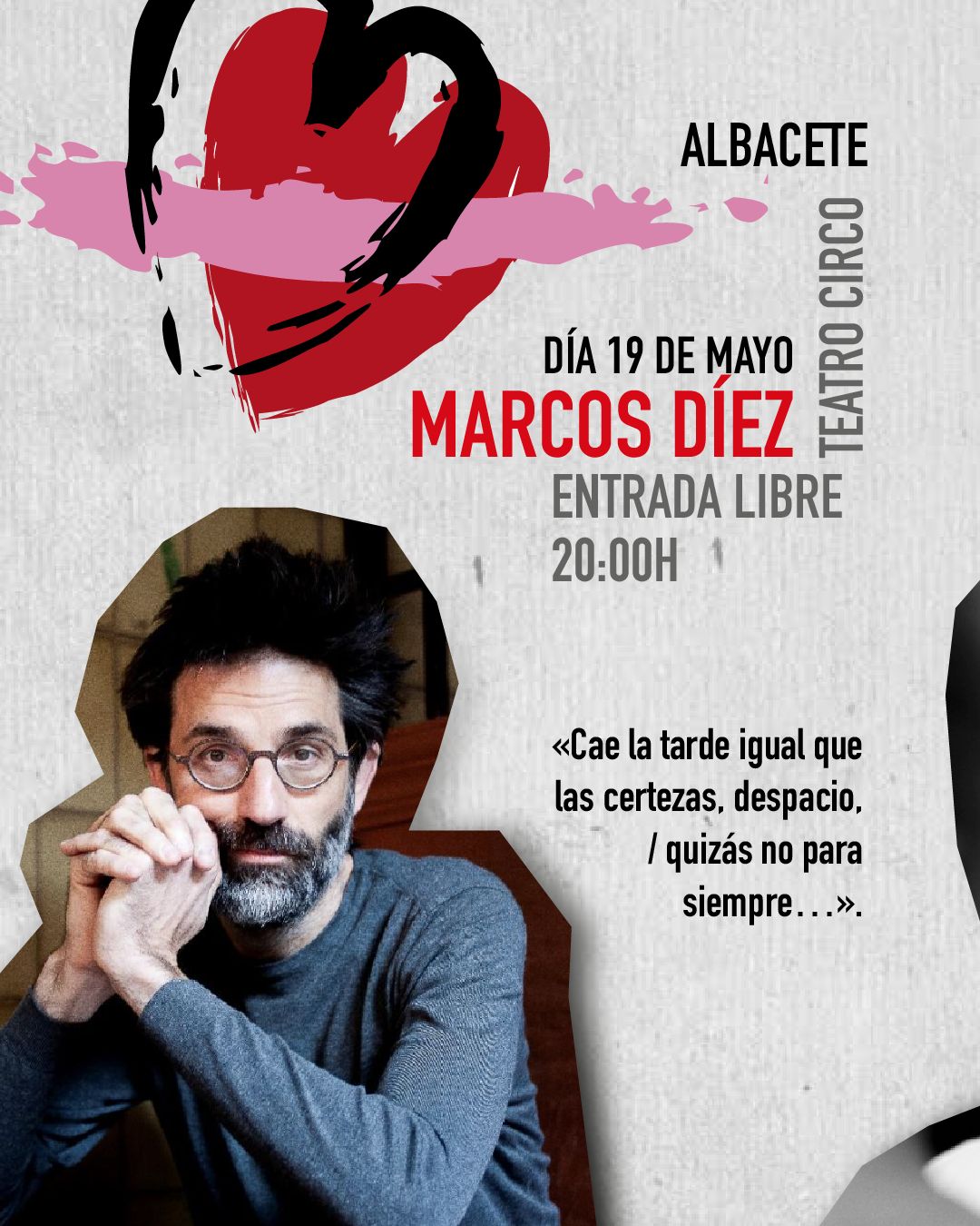 Marcos Díez (Santander, 1976). Es autor de los libros de poemas: Puntos de apoyo (Creática, 2010), Combustión (Visor, 2014), Desguace (Visor, 2018), Belleza sin nosotros (Visor, 2022) y Con sol dentro (poesía reunida 1999-2024), volumen editado por Visor con el apoyo de la Fundación Gerardo Diego y en el que se incluye un libro inédito, Besar la tierra, escrito entre 2022 y 2024. Ha sido reconocido con premios de poesía como el Hermanos Argensola, Ciudad de Burgos, Ciudad de Alcalá, José Hierro o Generación del 27. Es autor del libro de cuentos Desdoblados (Valnera, 2011) y de la recopilación de artículos El festín (Valnera, 2016).