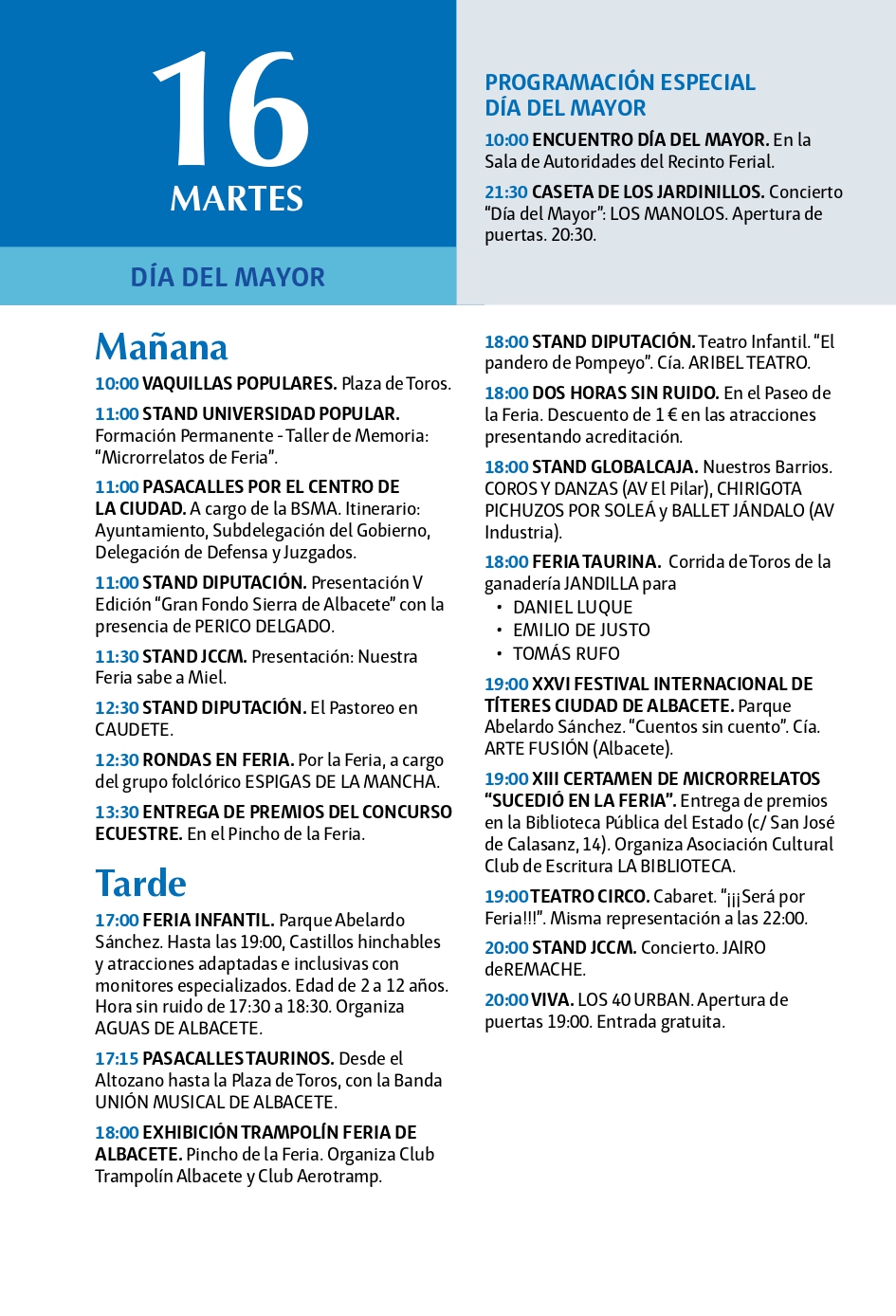 El día 16 de la Feria de Albacete 2025 está dedicado a la tercera edad, con una programación especial para honrar a los mayores de la ciudad. La jornada es un reconocimiento a su papel en la sociedad y en la conservación de las tradiciones locales.