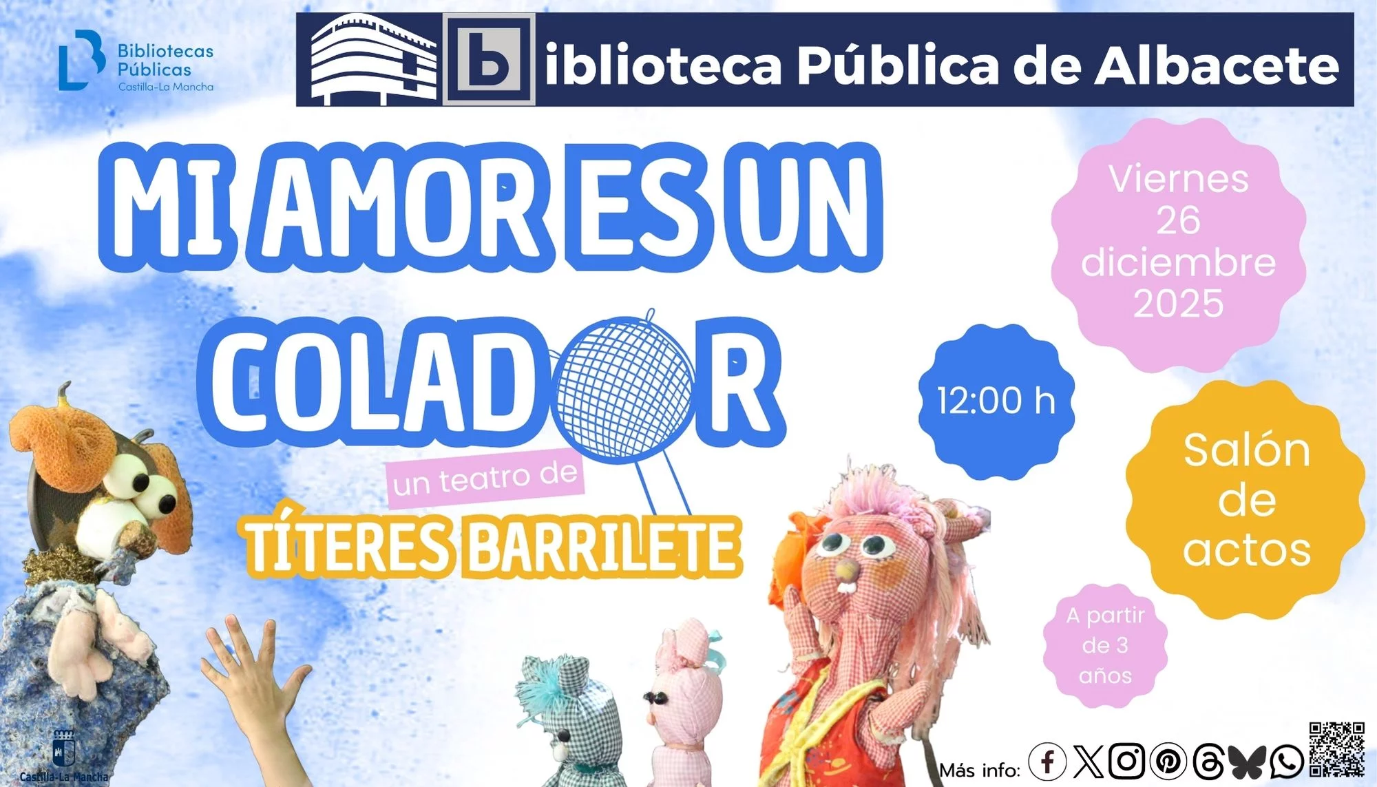 Este viernes 26 de diciembre (12:00 h), los objetos cotidianos cobran vida en «Mi amor es un colador». Una historia tierna para niños desde los 3 años donde no hay buenos ni malos, solo amistad, bondad y muchos suspiros.