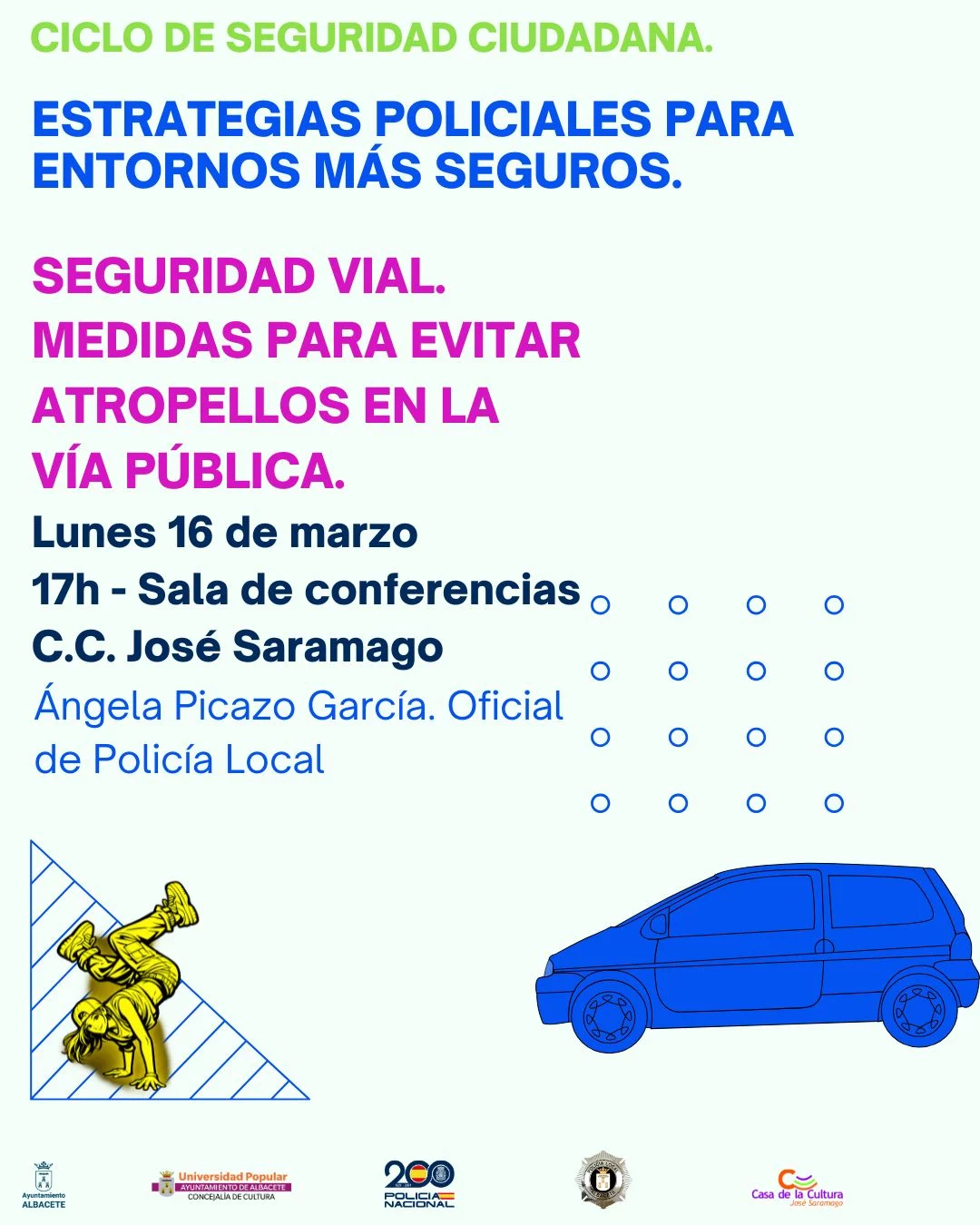 Dentro del ciclo de Seguridad Ciudadana, organizado en colaboración con la Policía Local y la Policía Nacional, la oficial de la Policía Local Ángela Picazo García impartirá la charla titulada “Seguridad vial. Medidas preventivas para evitar atropellos en la vía pública”.